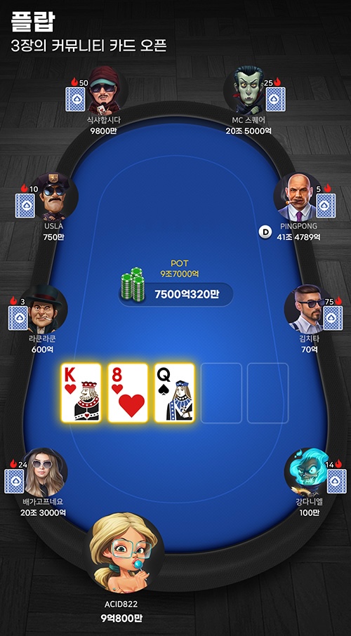 ํ๋ ์ดํ ํฌ์คํธ ํ๋์ผ๋ก ์งํ๋๋ฉฐ, ํ๋ ์ด์ด๋ 3์ฅ์ ์ปค๋ฎค๋ํฐ ์นด๋๊ฐ ์์ ์ ํธ๋ ์นด๋์ ์ด๋ค ์กฐํฉ์ด ๋์๋์ง์ ๋ฐ๋ผ ์ฒดํฌ, ๋ฒ ํ , ์ฝ, ํด๋ ๋๋ ๋ ์ด์ฆ๋ฅผ ํ ์ ์์ต๋๋ค.